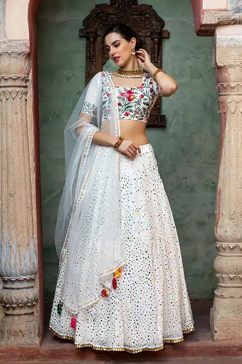 Elevate your style, exude charm, and captivate the crowd with our White Georgette Fancy Sequins Work Lehenga Choli Set. It’s not just a garment; it’s an expression of your timeless grace.