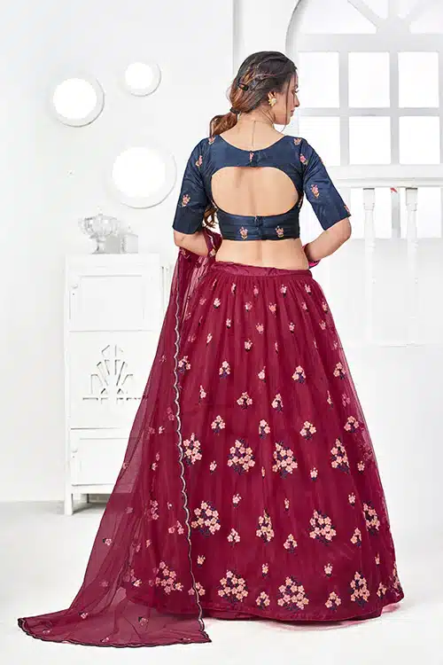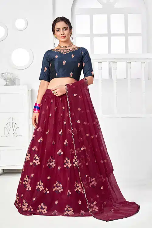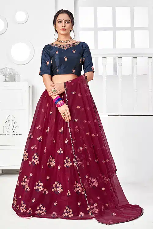 Elevate your ethnic wardrobe with our Maroon Net Embroidered Contrast Lehenga Choli Collection. Immerse yourself in the exquisite craftsmanship of thread and sequins embroidery adorning the maroon net fabric of the lehenga, blouse, and dupatta.