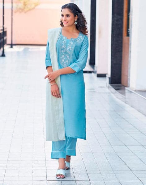 Sky Blue Plain Chinnon Straight Kurta Set with Dupatta